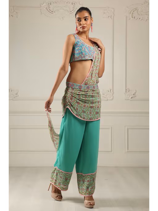 Channel your inner diva with this saree from House of Supriya. Crafted from georgette fabric. It features an exquisite printed design, finished with a stitched blouse and a chic dupatta. Style it with a pair of heels and diamond earrings for an elegant and soft look.