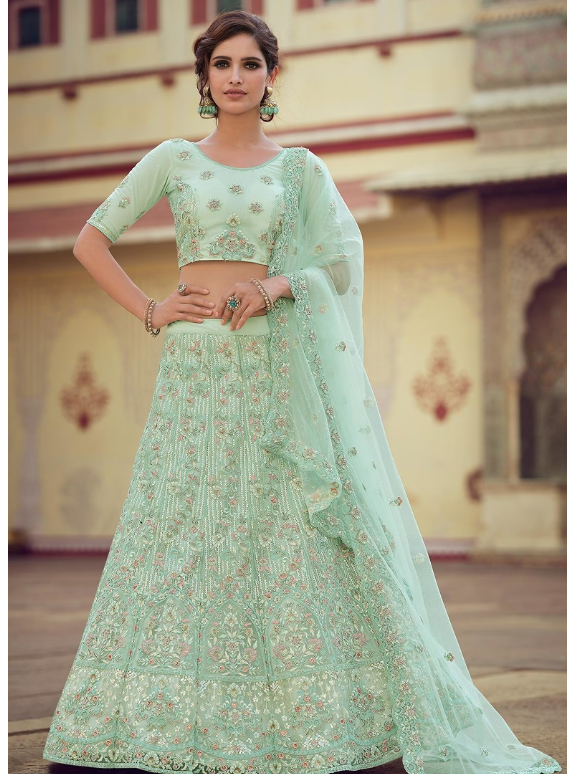 Green Sequin Zari Embroidered Georgette Lehenga Set