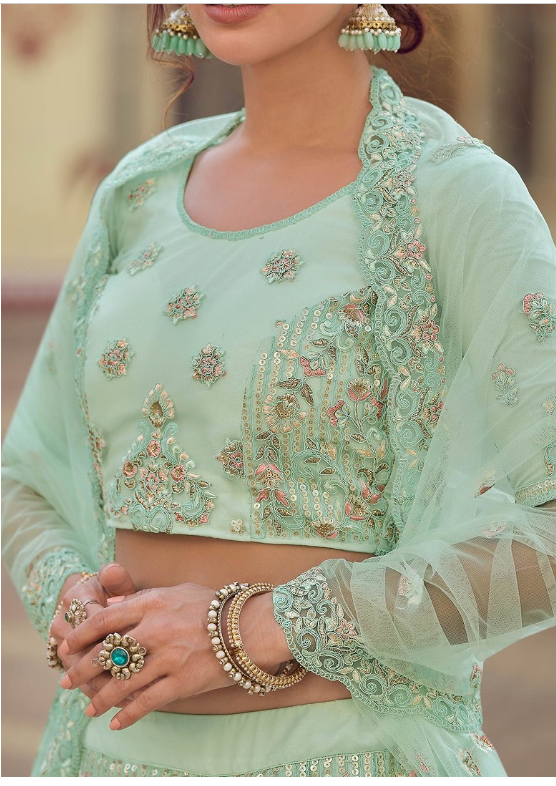 Step into elegance with this stunning Green Sequin Zari Embroidered Georgette Lehenga Set, designed to turn heads at every celebration. A beautiful blend of tradition and trend, it's your perfect pick for any grand event.