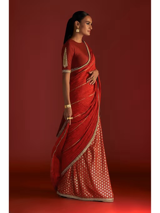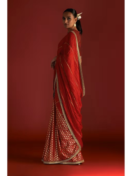 All Over Foil Print | Embellished Borders | Edged Kinari | Crushed Palla With Gota | Signature 'Paan-Patti' Motif Embroidered Blouse Piece. Tailored to sartorial perfection from premium quality fabric, it assures a soft and soothing touch against the skin. The exquisite silhouette adds to its appeal.