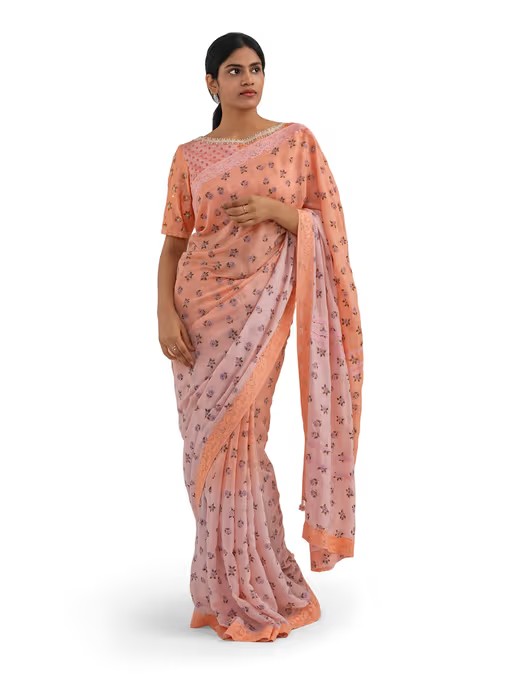 Peach Printed Muslin Silk Saree With Stitched Blouse