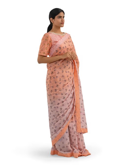 Make a style statement with this fancy peach floral saree set from Journal by Pranay. Made from high-quality silk, the blouse features half sleeves and a boat neck. It is paired with a fancy saree. Style it with minimal jewellery and sandals to complete the ensemble.