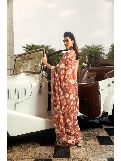 Make a timeless impression with this Brown printed saree that embodies whimsical blooms. Set in organza & muslin, the saree features adda embroidery with cut-daana, sequins & beads. The saree is available in both stitched and unstitched options. The pre-draped stitched saree comes with an attached petticoat, elastic waistband & an unstitched blouse bearing the same hand embroidery Brown border.