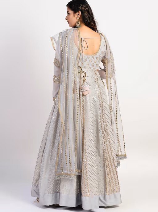 Featuring a silver-grey anarkali enhanced with cut-outs at the sides and embellished with sequins and lace on the sleeves giving a complete ensemble with intricate mirror embroidery on dupatta. Wear this look for a friend's wedding or during a family member's reception. Enhance the look with colourful kundan earrings.