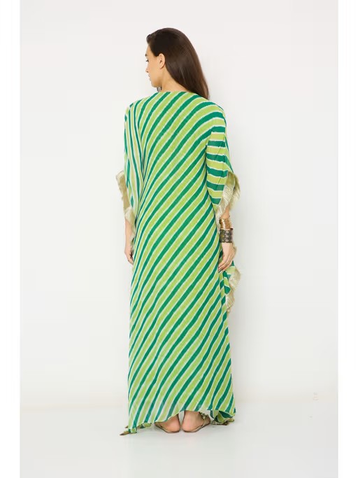 Green Leheriya Georgette Embroidered Yoke Kaftan Hand Embroidered Leheriya Kaftan With Gota Fringes.