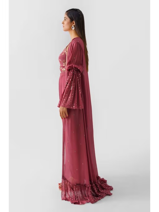 Adorn the styles specially made for you with this mauve set from Suruchi Parakh. Made from high quality georgette, it features pull on closure and embroidered pattern along with sleeveless & shoulder straps design. Pair it with trendy footwear to elevate your look.