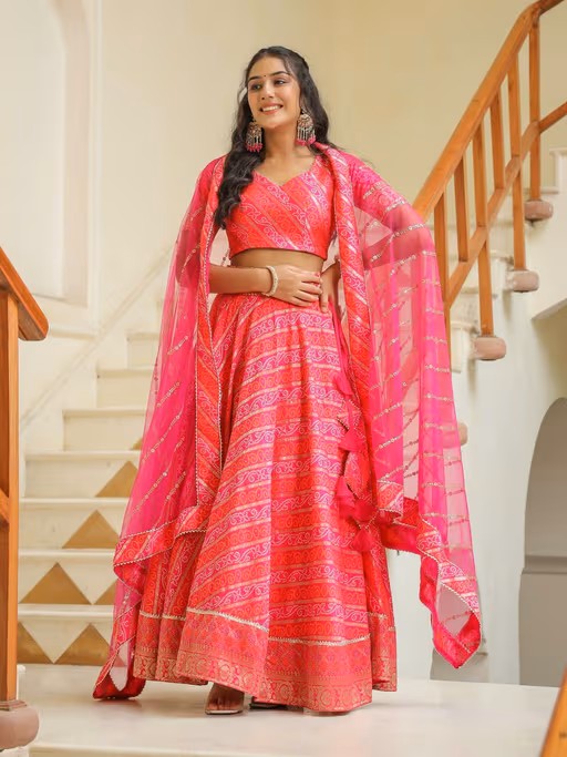 Pink Brocade Silk Bandhani Print Lehenga with Blouse & Dupatta (Set of 3)