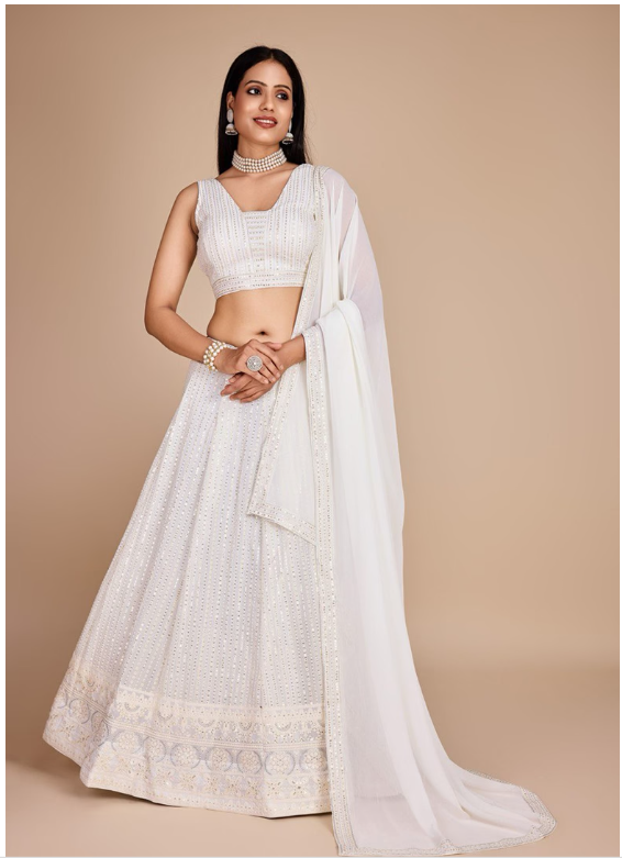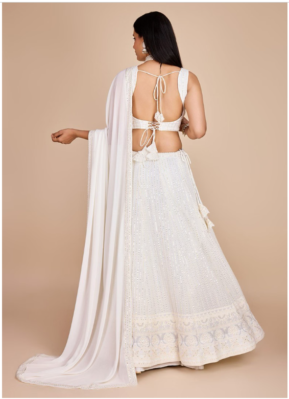 White Sequin Thread Embroidered Faux Georgette Lehenga Set