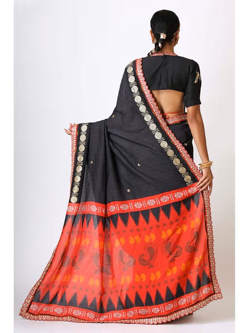 The Saree Is A Contemporary Take On Traditional Kanjeevarm Motifs And Design Philosophy. The Saree Combines Multiple Techniques Like Digital Print, Screen Print And Embroidery. The Saree Is A Statement Piece With The Eternally Classic Black And Red Colours.