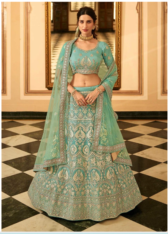 Step into elegance with this stunning Turquoise Blue Heavy Embroidered Organza Lehenga Set, designed to turn heads at every celebration. A beautiful blend of tradition and trend, it's your perfect pick for any grand event.