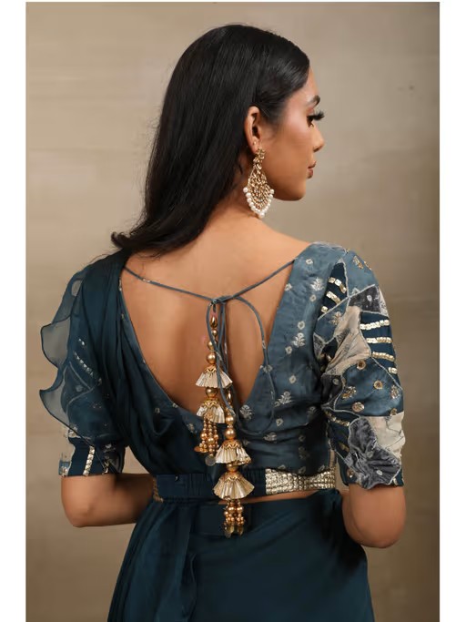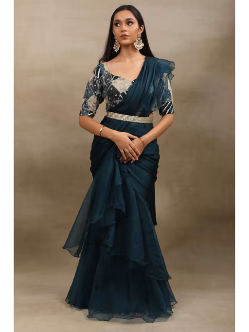 Experience the perfect fusion of comfort and style with this SAUBHAGYA Teal Embellished Pre Drape Saree and Belt with Stitched Blouse. It's ideal for any occasion and designed to flatter with ease and sophistication. Style it with heels, and carry a sling bag.