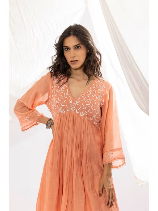 3P Set Includes Chanderi Mull Embroidered Chikan Kurta , Cotton Silk Bottom And Organza Dupatta.Peach Chanderi Mull Kurta With Chikan Embroidery On Front And Sleeves .It Has Slight Gatthers At Front. Peach Cotton Silk Bottom With Silk Organza Scallop Border At Hem. Straight Fit Bottoms With Front Belt And Elastic At Back . Peach Polka Dot Printed Chanderi Mull Dupatta With Lace All Around