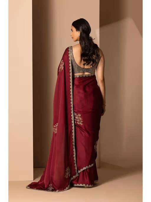 A Maroon Organza Saree Embellished with Rhinestones Border, Paired with Crepe Cut-Sleeves Blouse. Fabric : Organza (Saree) and Crepe (Blouse)Colour - Maroon