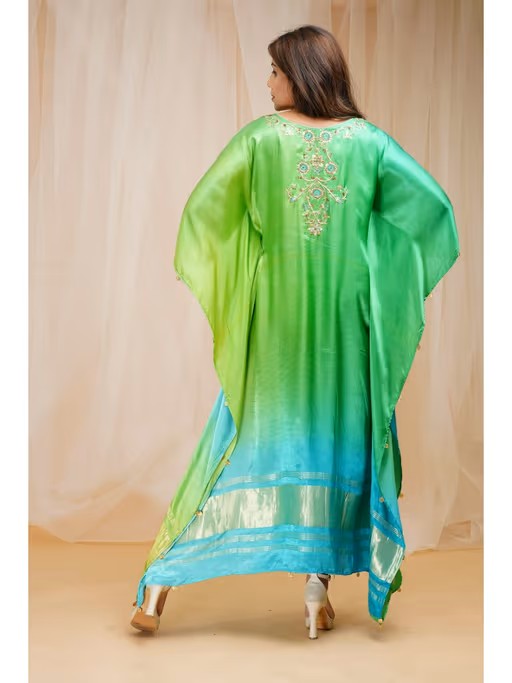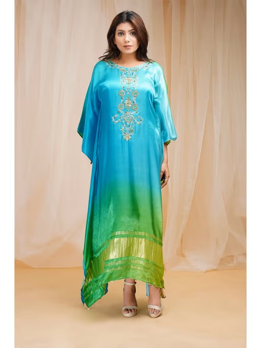 Hand Embroidered Modal Satin Silk Kaftan Dress - Coral Blue