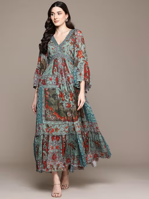 Elevate yours style with this green dress from Ritu Kumar. Crafted from viscose, this beautiful dress is finished with flared sleeves and a V-neck. Style it with a pair of heels and stud earrings.