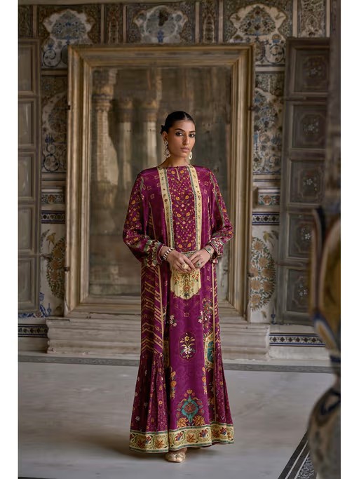 Elevate Your Fashionista Style with Our Jalabiya Dress, An Exciting Addition To Your Wardrobe. Crafted From A Luxurious Viscose Blend , The Sangria Shade Adds A Touch Of Allure, While The Mesmerizing Mughal Inspired Bloom Print Brings A Royal and Vibrant Energy.