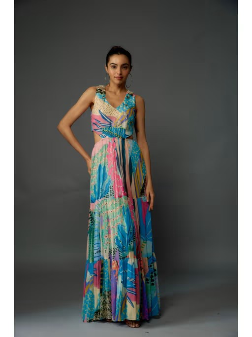Embrace elegance by stepping out in this captivating aqua tropical print art georgette embellished cut-out dress from PS Pret by Payal Singhal. Made from high-quality georgette, this piece features a sleeveless design and a v-neck. Style it with minimal jewellery and sandals to complete the ensemble.
