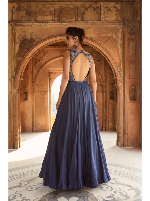Leave the crowd spellbound by stepping out in this captivating navy blue gown from Charu and Vasundhara. Made from high-quality tassel, this piece features pyramid embellished gown with diamond cutout back. Style it with minimal jewellery and sandals to complete the ensemble.