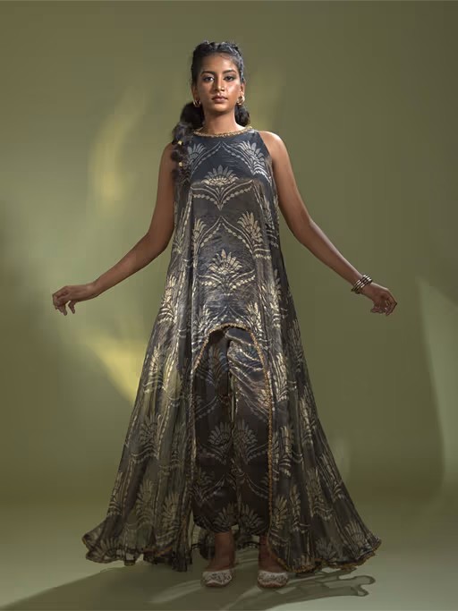 This Elegant Set Features An Asymmetrical Kurta And Matching Pants, Crafted From Deep Blue Printed Banaras Tissue Silk. The Kurta Has A High-Low Hemline With Delicate Golden Beads Embroidery Along The Edges. The Matching Pants Provide A Comfortable Fit.