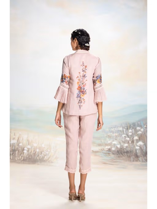 100% Linen Jacket And Inner Length 27" / Pant Length 36" / Model Height 5'9" A Short Jacket With Intricate Lace Running Around The Neck, With 3/4 Sleeves Feature Lace Inserts, Continuing Into Beautiful Knife Pleats That Flare Out The Hem, And Handmade Chord Closure Button. The Jacket Is Paired With A Round-Neck Shell Top Underneath For A Stylish And Refined Look. The Design Is Hand Screen-Printed, Featuring Four Layers Of Screens That Form Delicate Floral Designs In Captivating Colours, Achieved Through The Use Of Four Shades That Resemble The Appearance Of A Vintage Floral Rug Comfort Fit Mild Hand Wash