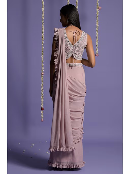 Featuring An Onion Pink Delicately Frilled Pre Draped Saree In A Shimmer Georgette Base. It Is Paired With A Matching Embroidered Crop Top In Sequins And Pearls With A Matching Belt.