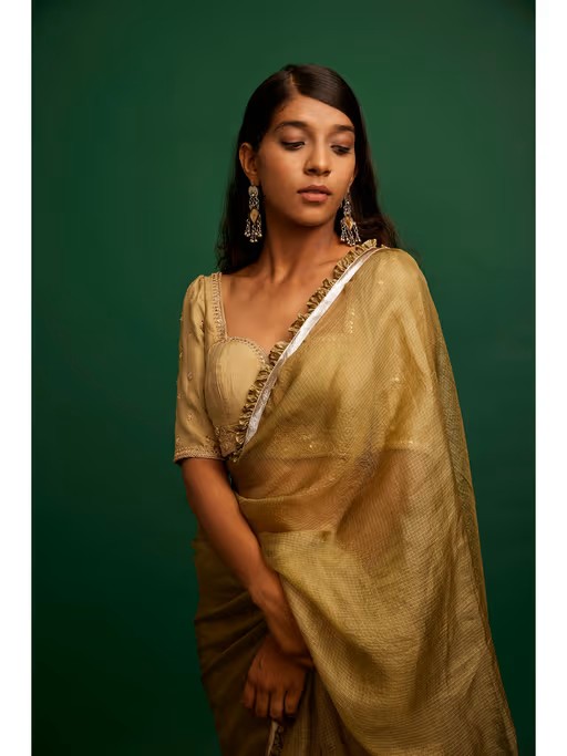 The Collection Features A Katana Kota Silk Saree In Beige, Detailed with Tissue Frill Border and Signature Marori Work.