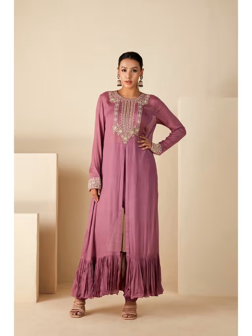 Adorn the styles specially made for you with this mauve set from Suruchi Parakh. Made from high quality georgette, it features button fly closure and embroidered pattern along with full sleeves & round neck design. Pair it with trendy footwear to elevate your look.• Return Eligibility: Returnable within 15 days of delivery