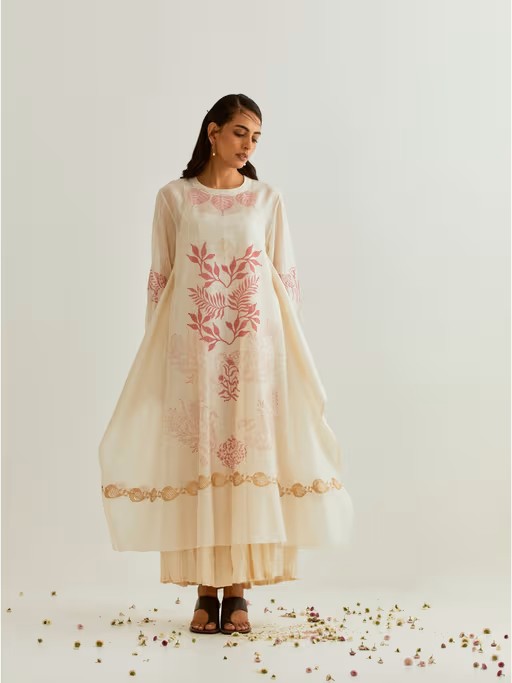 Make a style statement with this ivory printed kurta set from PRAMA by Pratima Pandey. Made from high-quality chanderi, the kurta features full sleeves and a round neck. It is paired with a fancy inner. Style it with minimal jewellery and sandals to complete the ensemble.