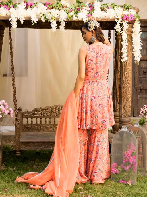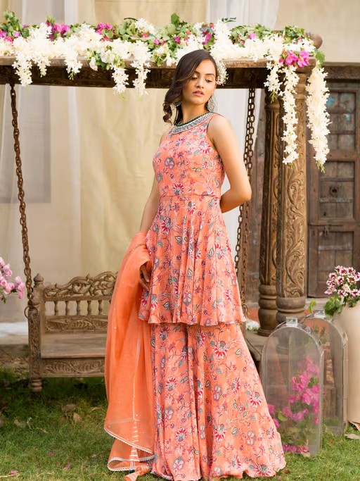 For a truly majestic aura that exudes an enchanting radiances, your outfit makes all the difference. This exquisite set from Chhavvi Aggarwal features a beautiful kurta, a pair of shararas and a dazzling dupatta. This kurta with an exquisite embroidered neckline and a ravishing printed pattern is a stunning element in this set. The organza dupatta with paired with printed sharara beautifully brings the whole outfit together. Club with a pair of chandbali earrings and matching heels to complete the look like a diva.