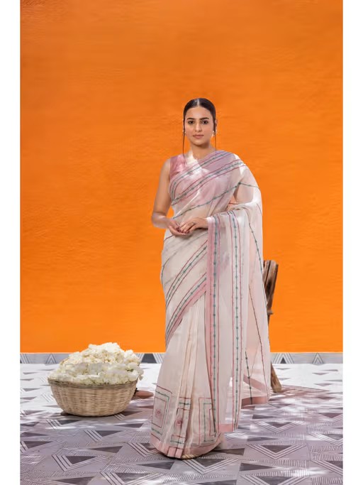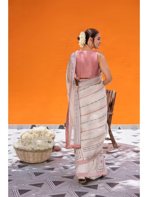 Ivory Organza Saree, Adorned with Resham and Aari Box Motifs Throughout, Creating A Delicate Yet Intricate Design. The Pallu Features Stripes Work, Adding A Contemporary Flair To This Traditional Attire. Paired Elegantly with A Pink Chanderi Blouse, This Ensemble Captures Timeless Charm with A Modern Twist.