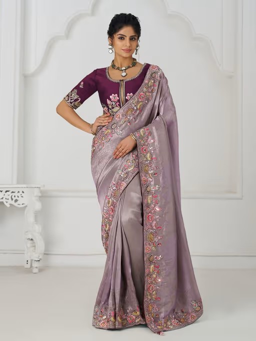 Lavender Viscose Silk Embroidered Saree with Unstitched Blouse