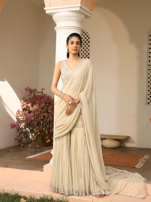 Our draped saree look is for the rooted fashionistas out there.Comfotable saree style with intricate embroidery on its blouse and border. Tailored to sartorial perfection from premium quality fabric, it assures a soft and soothing touch against the skin. The exquisite silhouette adds to its appeal.