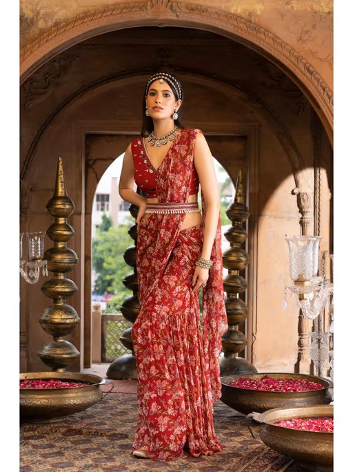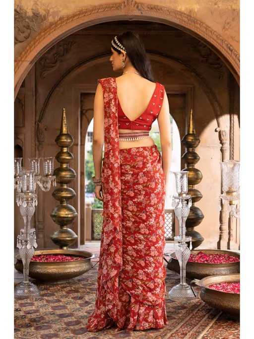 Featuring Here A Red printed saree with embroidered blouse. This set comes with an embroidered belt.