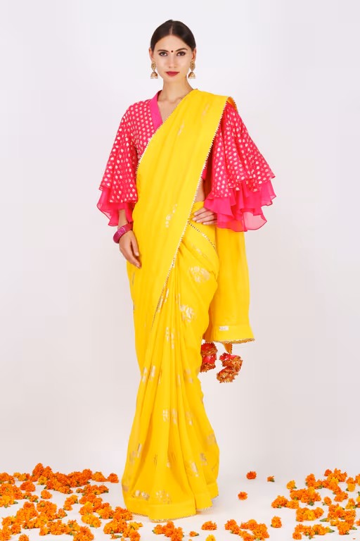 This yellow saree by Nikasha is crafted in georgette with jaipuri guldasta foil prints and samosa lace detailing. It is paired with a rani pink georgette blouse with bell sleeves featuring jasmine bud foil prints. This look is ideal for wedding sangeet and mehendi functions. This product can be customised to your requirements for size or colour. Please use the Nykaa Fashion App, and click on the whatsapp icon to get in touch with our customisation experts to place your order.