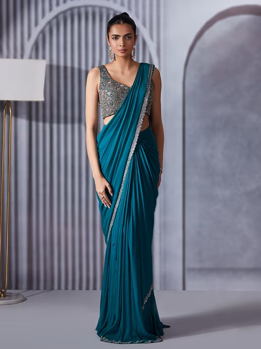 Turquoise Pre Draped Saree with Blouse with Stitched