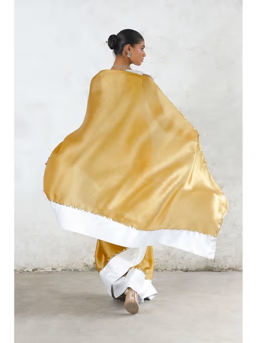Handcrafted Saree In Pure Silk Satin Organza, Adorned With A Broad Silver Gota Border And Hand-Embroidered Gota Patti Detailing. This Saree Comes With A Plain Silver Unstitched Blouse Piece.