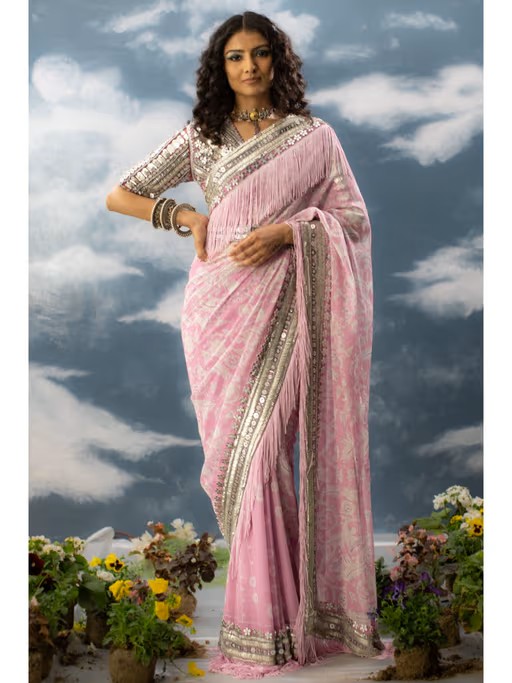 Lilac Pink Printed & Embroidered Saree In Chiffon with Unstitched Blouse