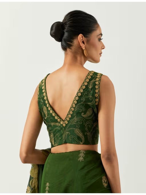 To look beautiful this wedding season, grab this lovely green saree blouse set. It is crafted from premium quality. It features embroidered pattern with sleeveless, v-neck style. Pair it with matching jewellery and heels for the gorgeous look.