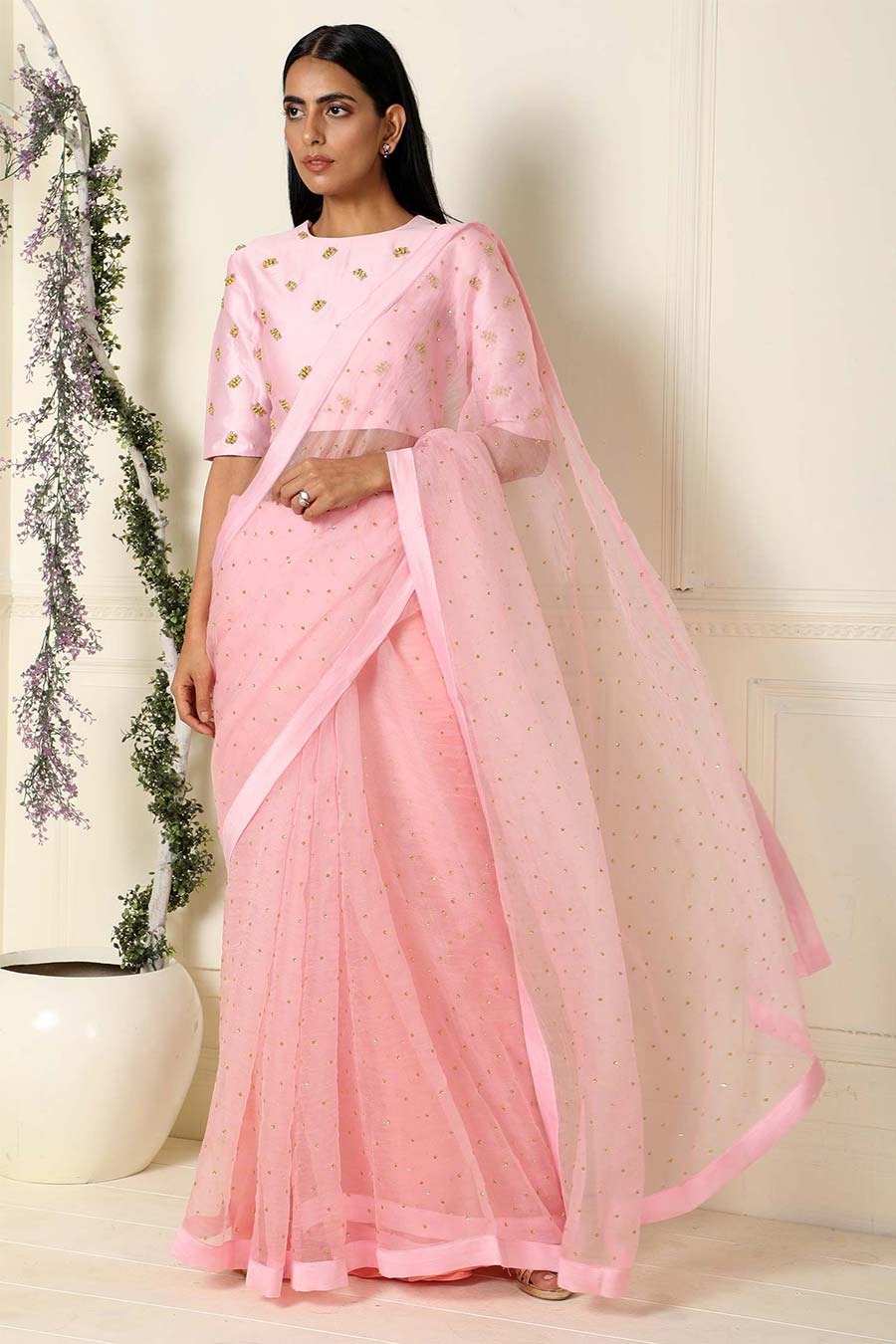 • Paired with a matching chanderi blouse with safety pin embroidery scattered all over