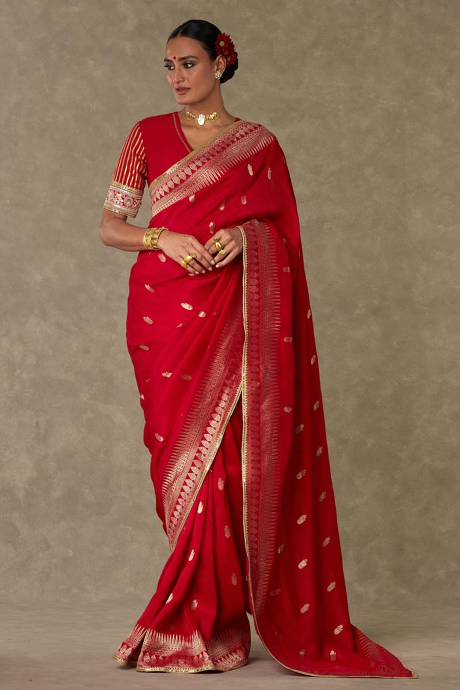 Red Haath Phool Embroidered Saree with Blouse Piece