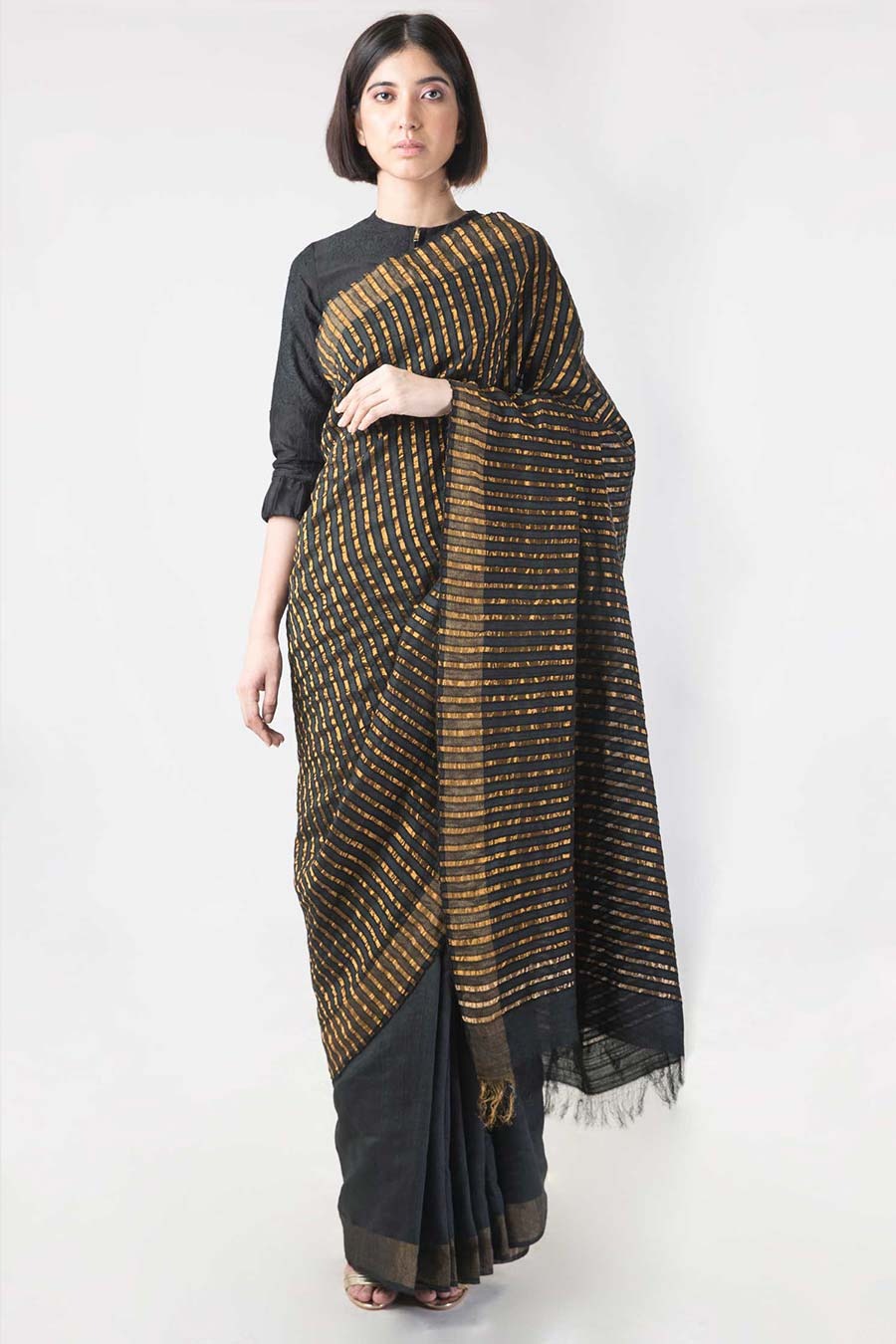 • This saree is adorned by golden zari border and zari stripes with dori on 2.5m of the saree starting from pallu