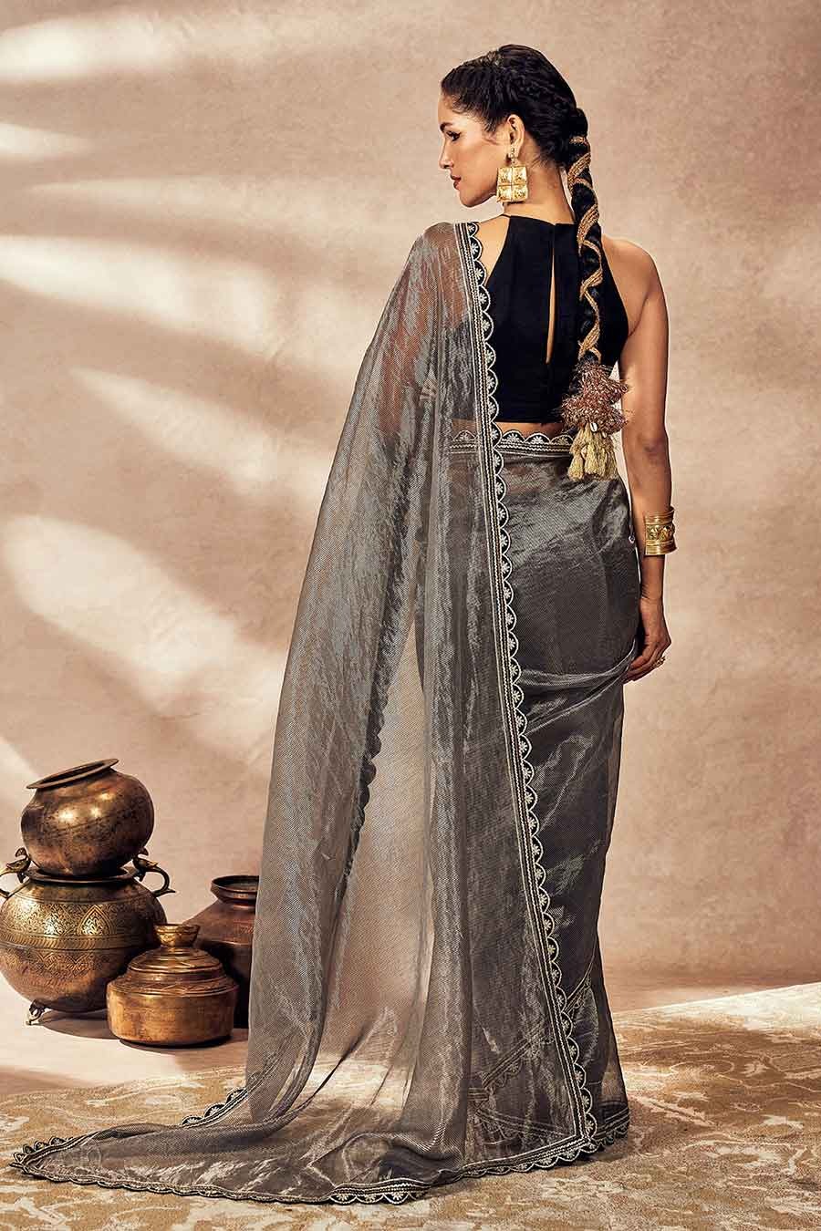 • Black and silver pinstripe saree