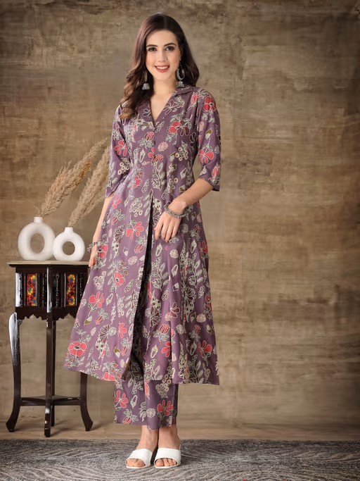 Mauve floral printed rayon front slit kurta with shirt collar, buttons on yoke and printed pant which has full elasticated waistband. Pair it with beautiful accessories like jhumkas, kadas and jutties to enhance the look. Products Length - 46" Inch, Pant Length - 38" Inch.