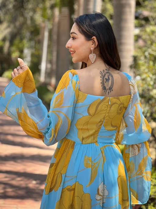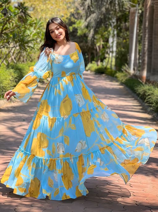 Essence of summer elegance with our Ploy Georgette Dress, a mesmerizing blend of style and comfort designed to adorn your vacation days with grace. Crafted from airy georgette fabric.Embrace the vibrant spirit of the season with its Floral print,this dress is your perfect companion for any summer escapade.where style meets comfort in perfect occasion.