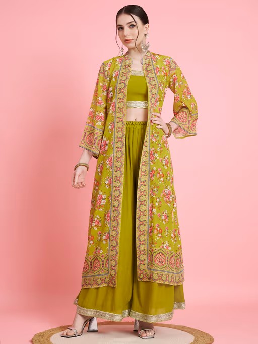 Women's Shrug Style Printed Embroidered crop Top Palazzo Shrug Set For Women. Crop (top) Fabric: Viscose Rayon || Crop (top) Style: Crop Top || Crop (top) Length: 9 Inches || Pattern: Lace Work Colour: Parrot-Green || Sleeve Type: Shrug Sleeve: 3/4 Sleeves || Sleeve Length: Shrug: 18 Inches || Neck Type: Round Neck Embroidered Top With Palazzo and Shrug Set For Fusion. Product Type: Top Choli With Shrug And Palazzo Fusion Set || Wear on Party wear, Wedding wear Festive wear, Traditional wear, Ethnic wear, Fusion Wear, Classic Wear, Anniversary, Birthdays, Kitty Parties, Outings, Engagement, Baby Shower. Gift: Special Gift, Birthday Gift, Anniversary Gift, Engagement Gift, Valentine's Day Gift for Girlfriend, Gift for Wife, Valentine's Day Gift for Wife, Birthday Gift. Lehenga Choli Set, Lehenga Choli with Shrug, Fusion Wear, Wedding Wear Clothes, Ethnic Collection. Top Details : Type: Indo-Western, Crop-Top Style.