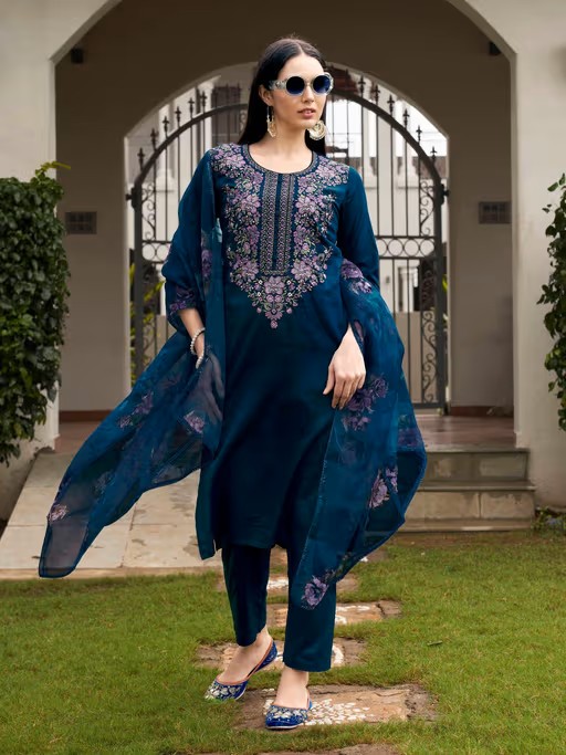 Step into grace with this Tikhi Imli Teal Blue Embroidered Kurta and Pants with Dupatta. It is crafted from high-quality fabric. It features a three-fourth sleeves and v-neck kurta style, and a ankle, mid-waist style. It epitomizes understated elegance, perfect for festive, wedding, or special occasions.