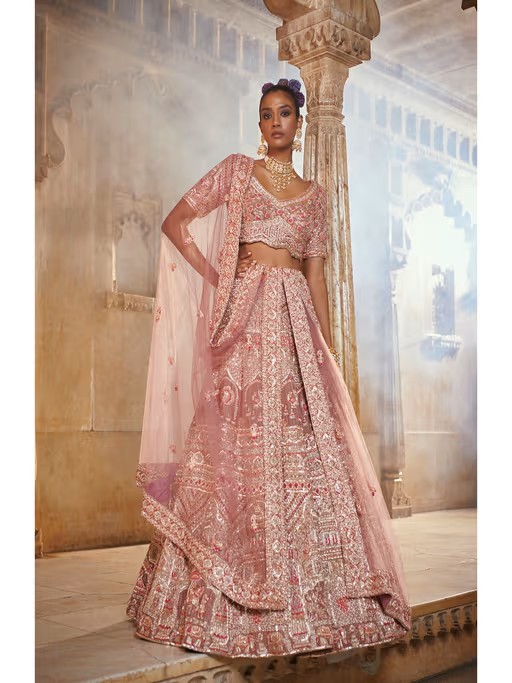 Presenting an elegant pink lehenga, blouse, dupatta set from Bindani by Jigar and Nikita. It is crafted from high-quality. It features embellished & sequined pattern with beads and stones work, blouse styles half sleeves, v-neck and mid waist rise style. It is perfect for wedding or any special occasions.
