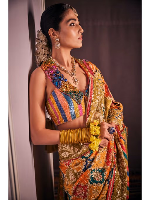 Experience The Elegance And Beauty Of Our Exquisite Saree Set, Adorned With Intricate Embroidery Details Such As Rainbow Sequence, Stones, And Crystals Paired With Blouse