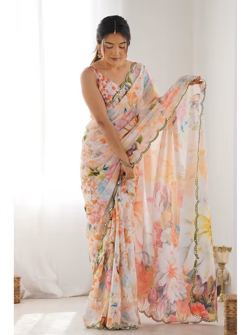 Multi-Color Yellow Digital Printed Chinon Saree with Unstitched Blouse