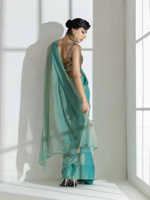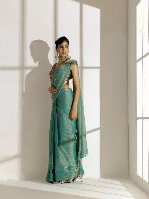 Enchant with the Paris Green Chiffon Saree featuring a luxurious paisley gold design throughout and beaded latkan on the pallu end This combination of vibrant green and opulent gold creates a sophisticated and striking look perfect for any elegant event